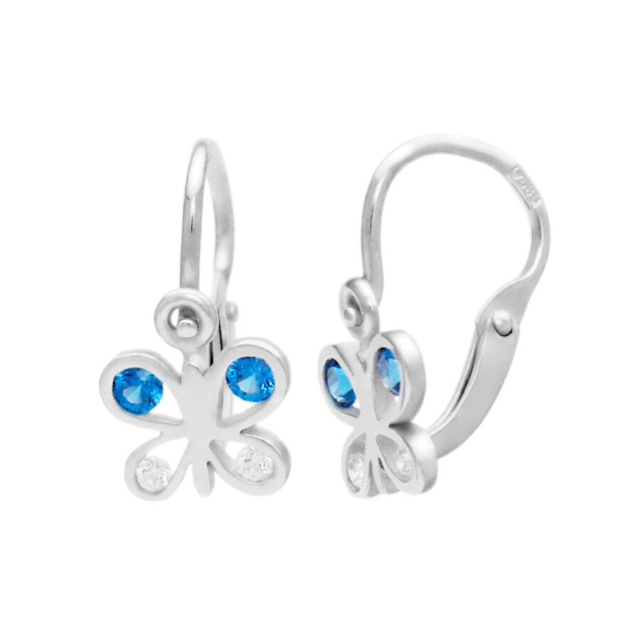 Dětské náušnice bílé zlato Motýl tmavě modré a bílé zirkony