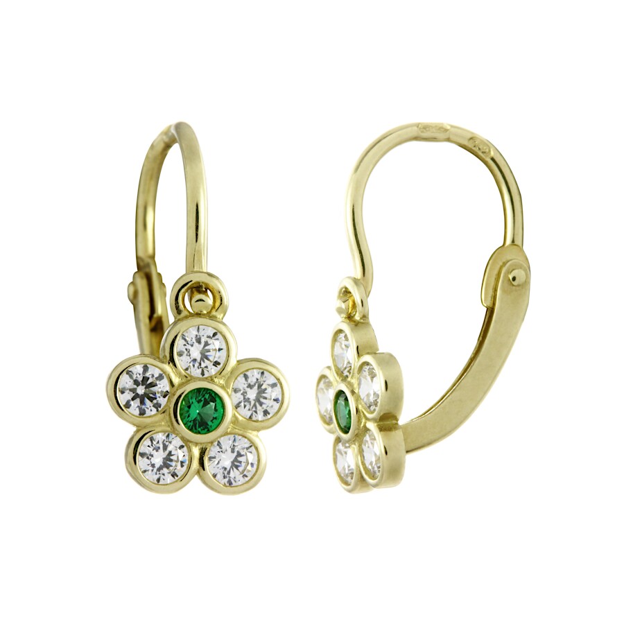 Dětské náušnice zlaté Květinka zirkony bílé a střed zelený zirkon