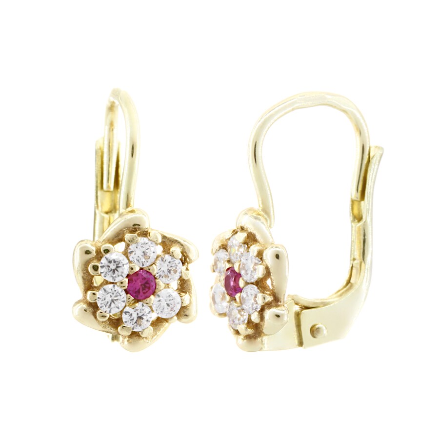 Dětské náušnice zlaté Květinky střed červený zirkon a bílé zirkony