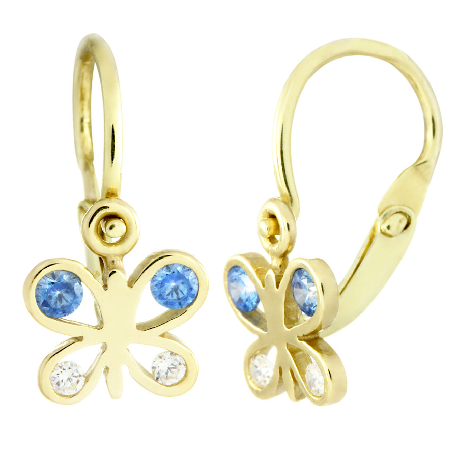 Dětské náušnice zlaté Motýl modré a bílé zirkony