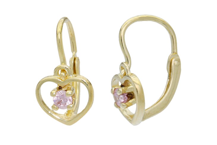 Dětské náušnice zlaté Srdíčka růžový zirkon