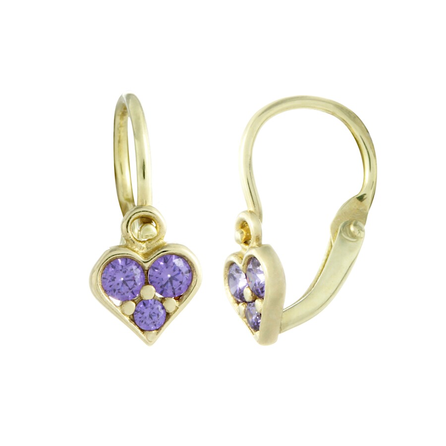 Dětské náušnice zlato Srdíčko fialové zirkony