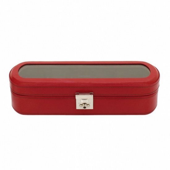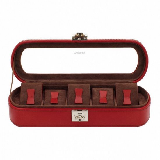 Kožená červená kazeta s hnědým interiérem na 5ks hodinek, víko je transparentní