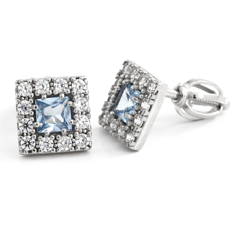 Náušnice bílé zlato Čtvereček střed světle modrý zirkon