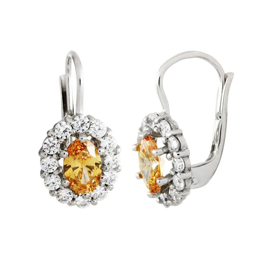 Náušnice bílé zlato Ovál bílé zirkony a střed champagne zirkon