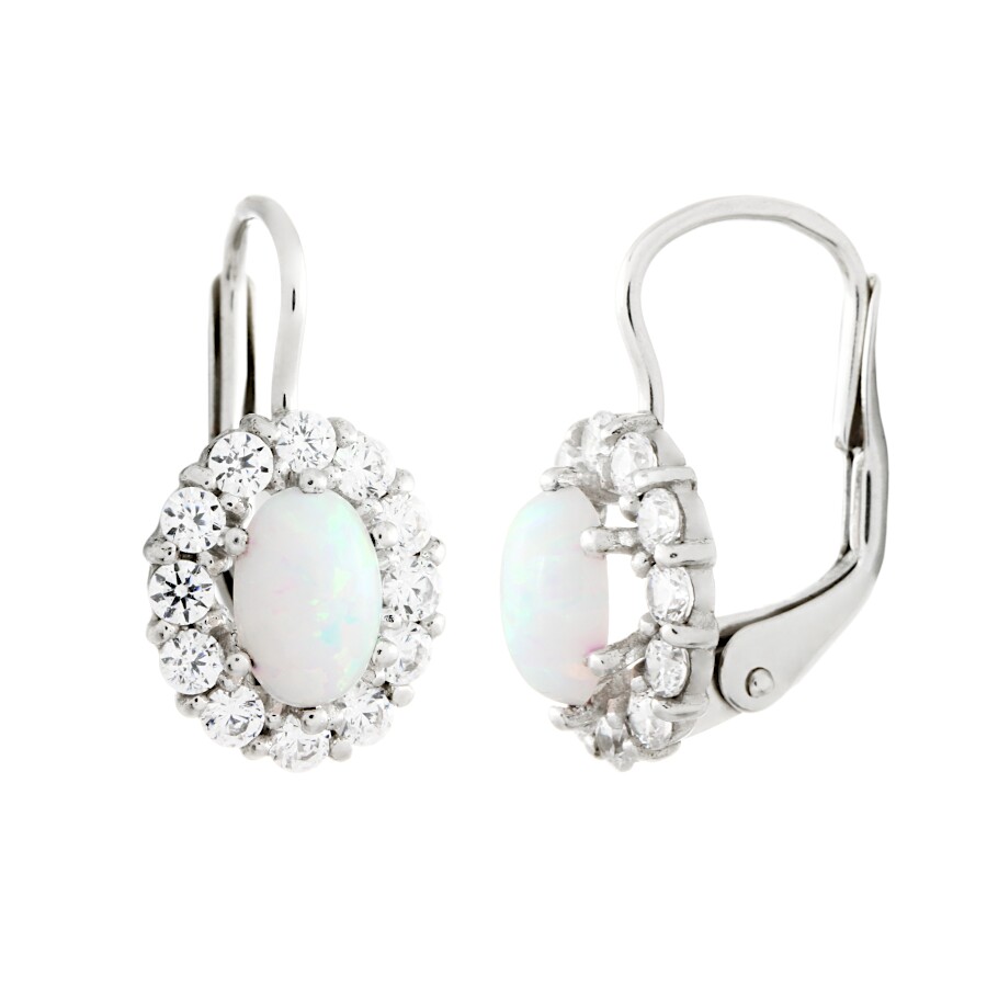 Náušnice bílé zlato Ovál střed syntetický bílý opál se zirkony
