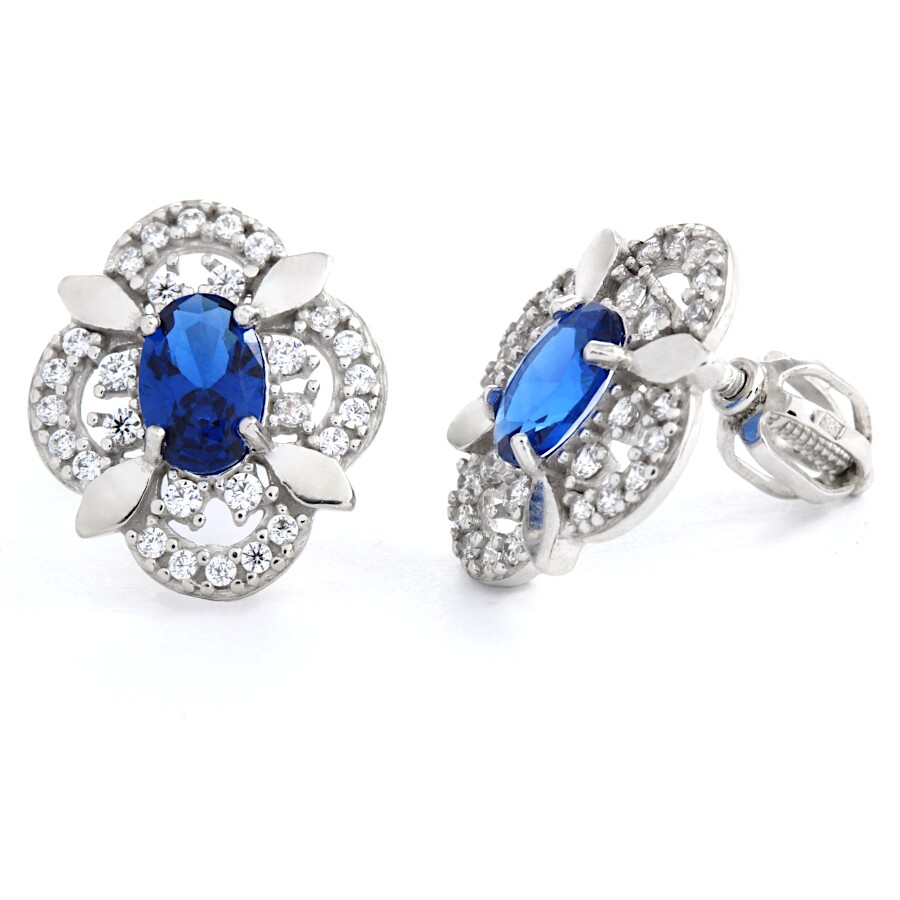 Náušnice bílé zlato Ovál střed tmavě modrý zirkon