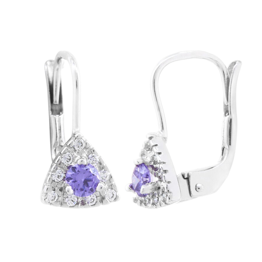 Náušnice bílé zlato Trojúhelníky střed fialový zirkon