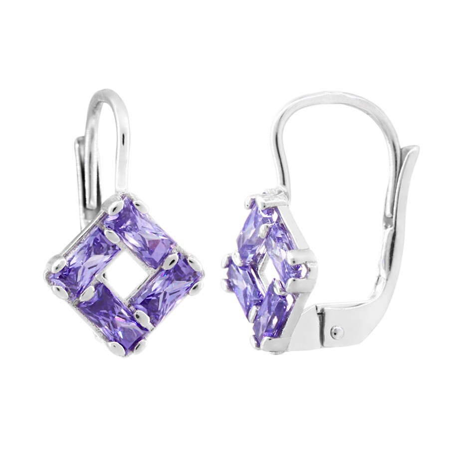 Náušnice dětské bílé zlato Čtverce s fialovými zirkony