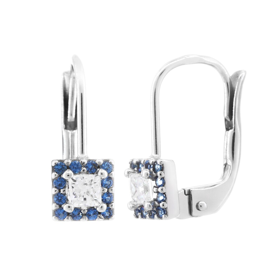 Náušnice dětské bílé zlato Čtvereček modré a bílé zirkony