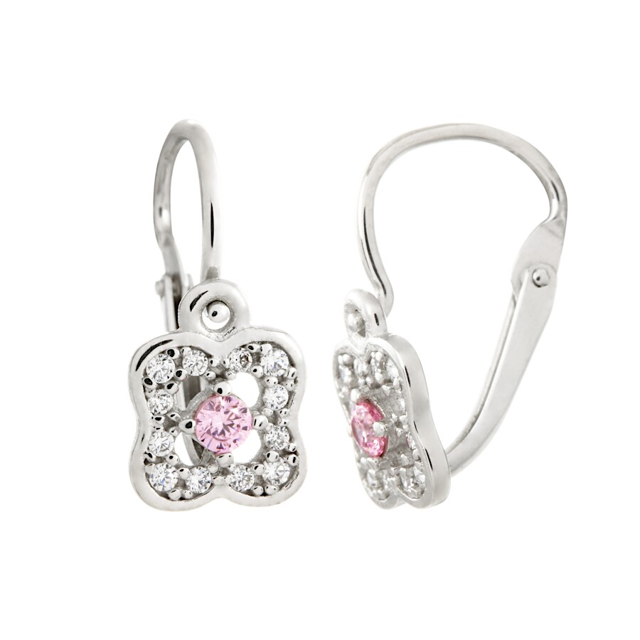 Náušnice dětské bílé zlato Čtyřlístek střed růžový zirkon a bílé zirkony