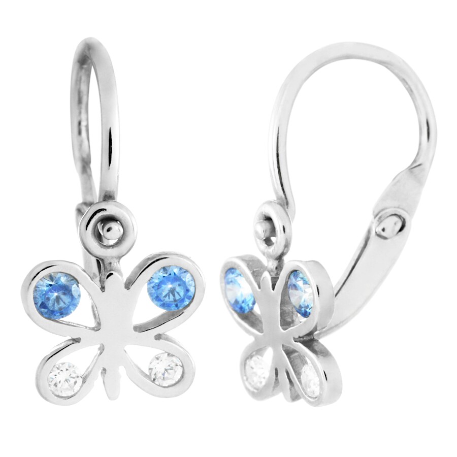 Náušnice dětské bílé zlato Motýlek modré a bílé zirkony