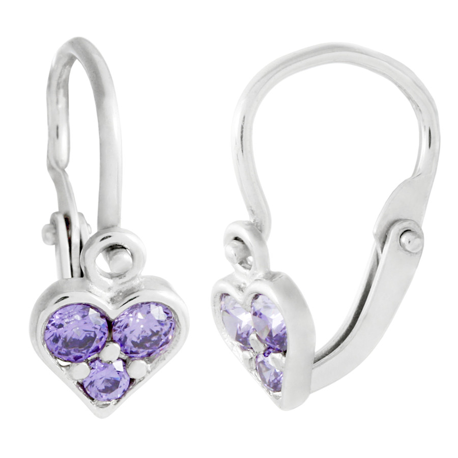 Náušnice dětské bílé zlato Srdíčka fialové zirkony