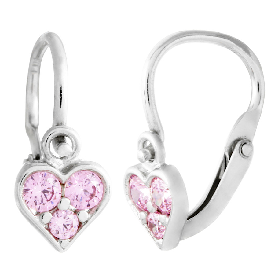 Náušnice dětské bílé zlato Srdíčka růžové zirkony