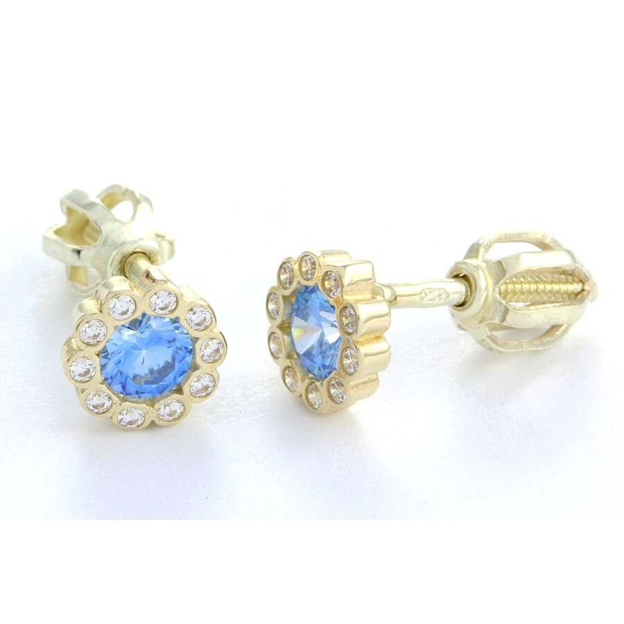 Náušnice zlaté Květina střed modrý zirkon a zirkony bílé