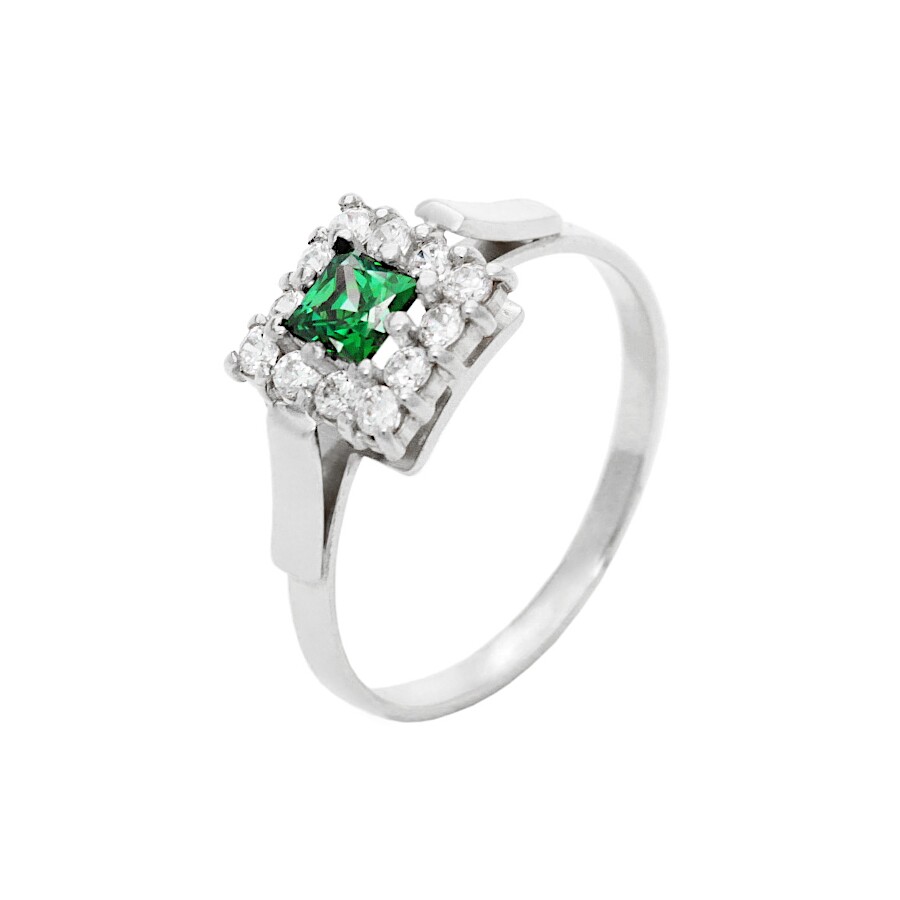 Prsten bílé zlato Čtverec střed zelený zirkon
