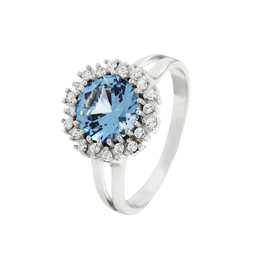 Prsten bílé zlato Kolečko střed syntetický akvamarín se zirkony